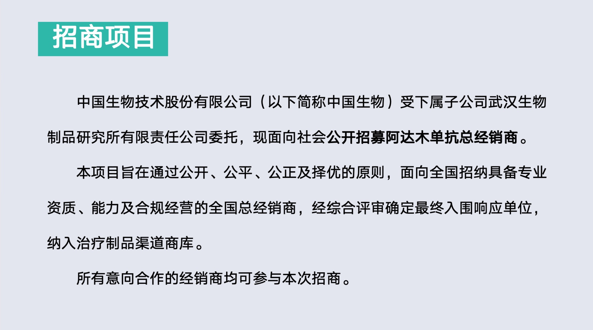 【招商公告】中國生(shēng)物技術股(gǔ)份有限公司(sī)2025至(zhì)2028年阿達木單(dān)抗(kàng)總經(jīng)銷商招商公告