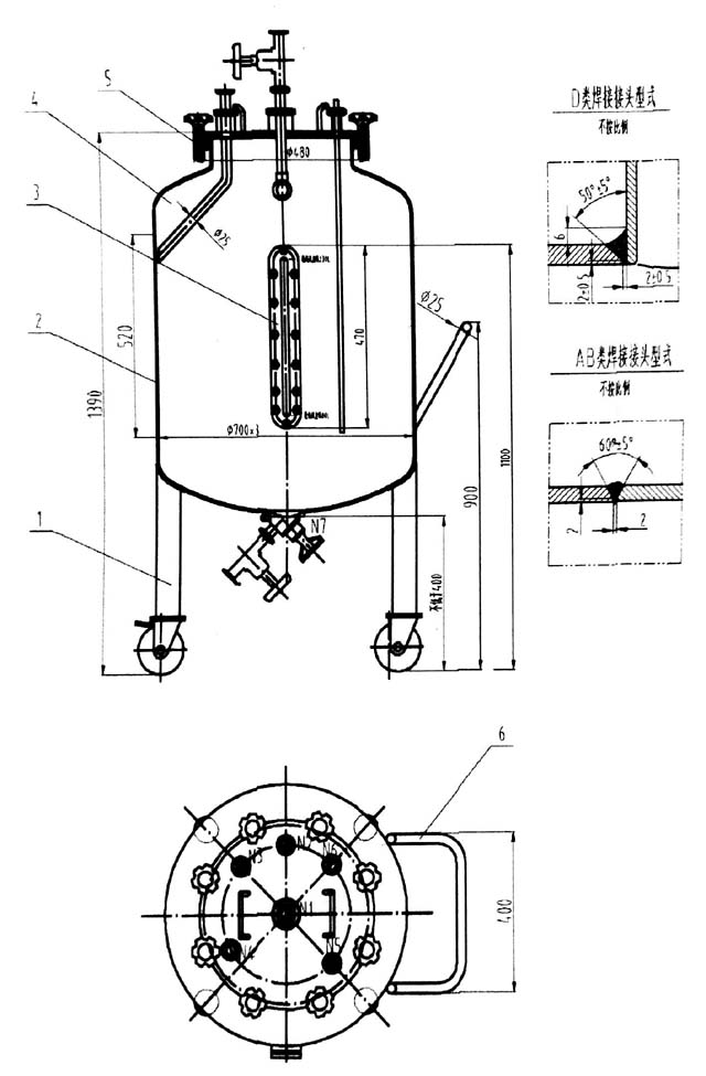 4.3.8.3罐底出(chū)口到地麵(miàn)的距離(lí)≥350mm,罐內擴物(wù)料過流和接觸部件的材料采用SUS316L不鏽鋼,其餘(yú)材料采用SUS304不鏽鋼(gāng)。
